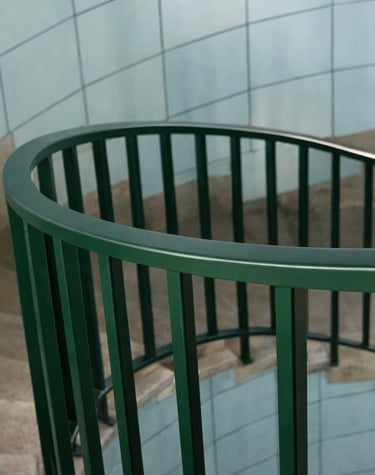 מעקות מעוצבים למדרגות, מרפסות וחללים פנימיים, בגימורים שחור מט וברונזה עתיקה.